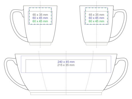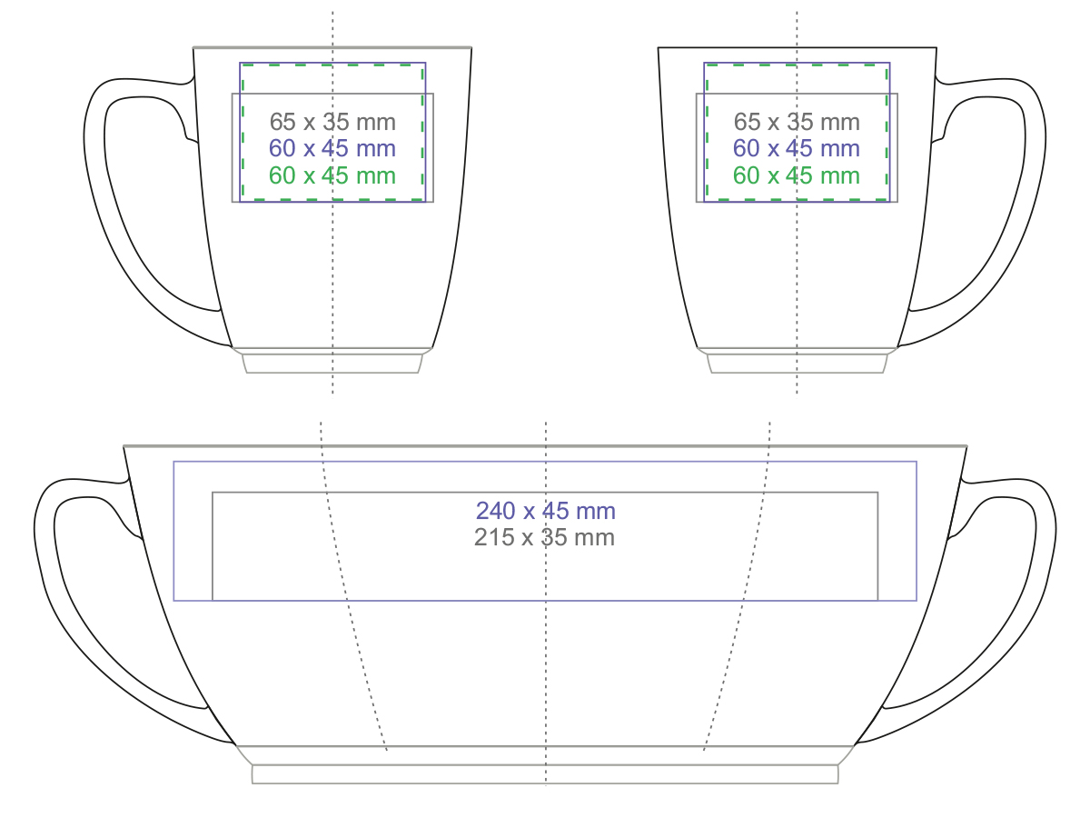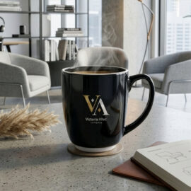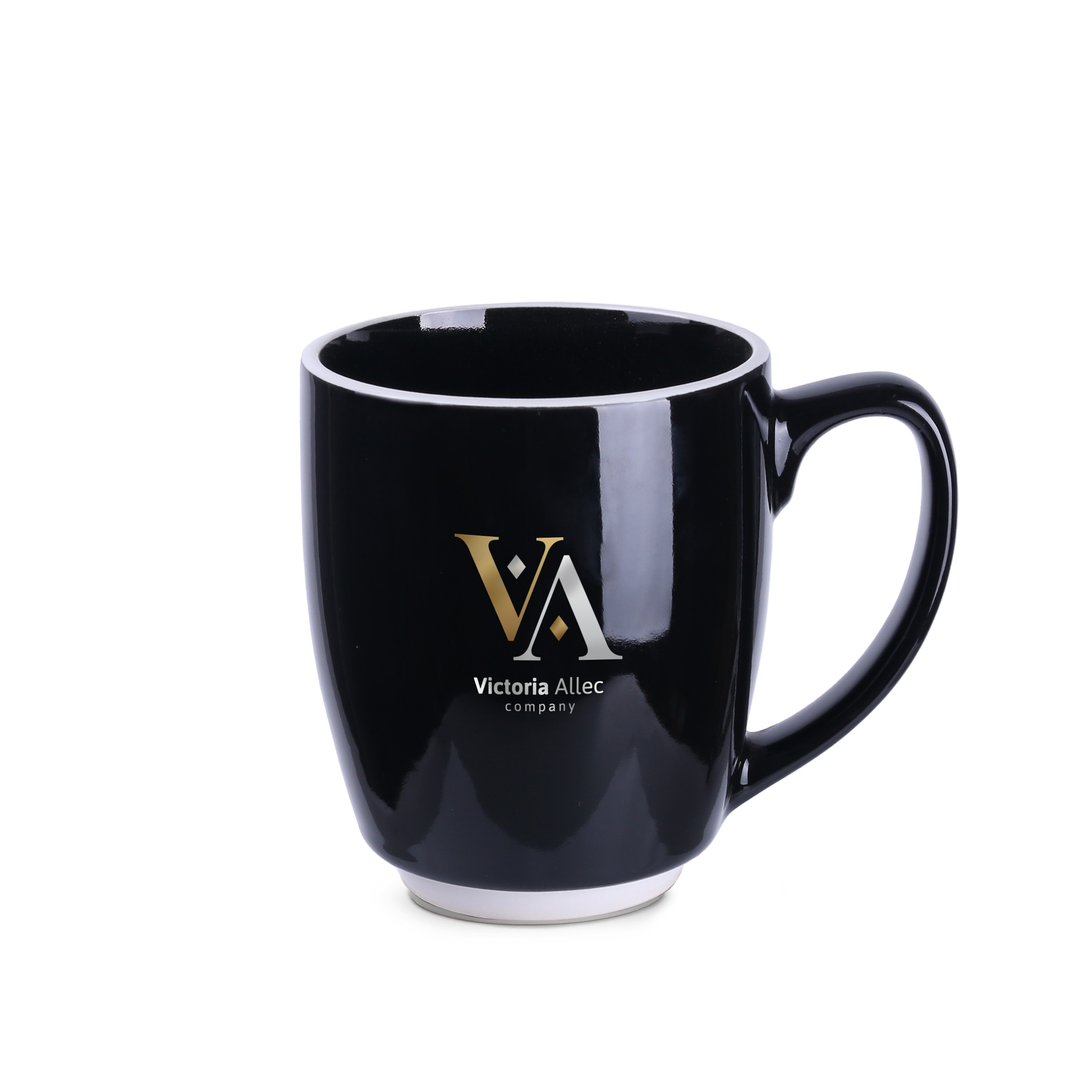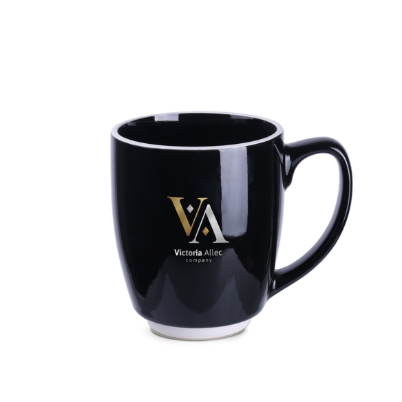 Designerski czarny kubek reklamowy o obłym kształcie z charakterystycznymi białymi wykończeniami na rancie oraz w dolnej części. Model o dużej pojemności.