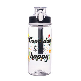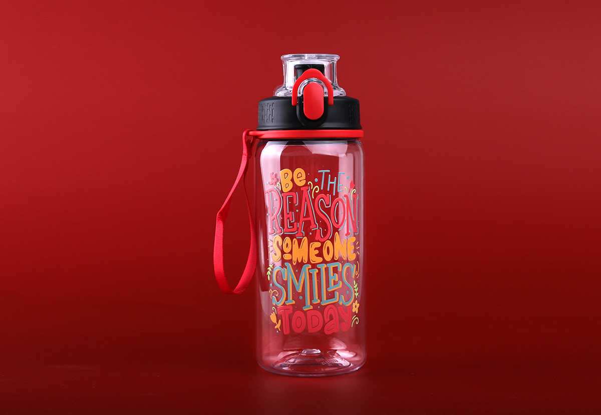 Bidon wykonany z tritanu – materiału, który jest w pełni bezpieczny, lekki, nietłukący, nie powoduje zmiany smaku przechowywanych napojów, chroni napój przed promieniowaniem UV. Dzięki występującej w kilku opcjach kolorystycznych, wykonanej z materiału smyczy na nadgarstek stanowi idealny upominek nie tylko dla osób aktywnych. Dodatkowo posiada zabezpieczenie manualne uniemożliwiające przypadkowe otwarcie. Idealnie nadaje się do nanoszenia kolorowych nadruków.