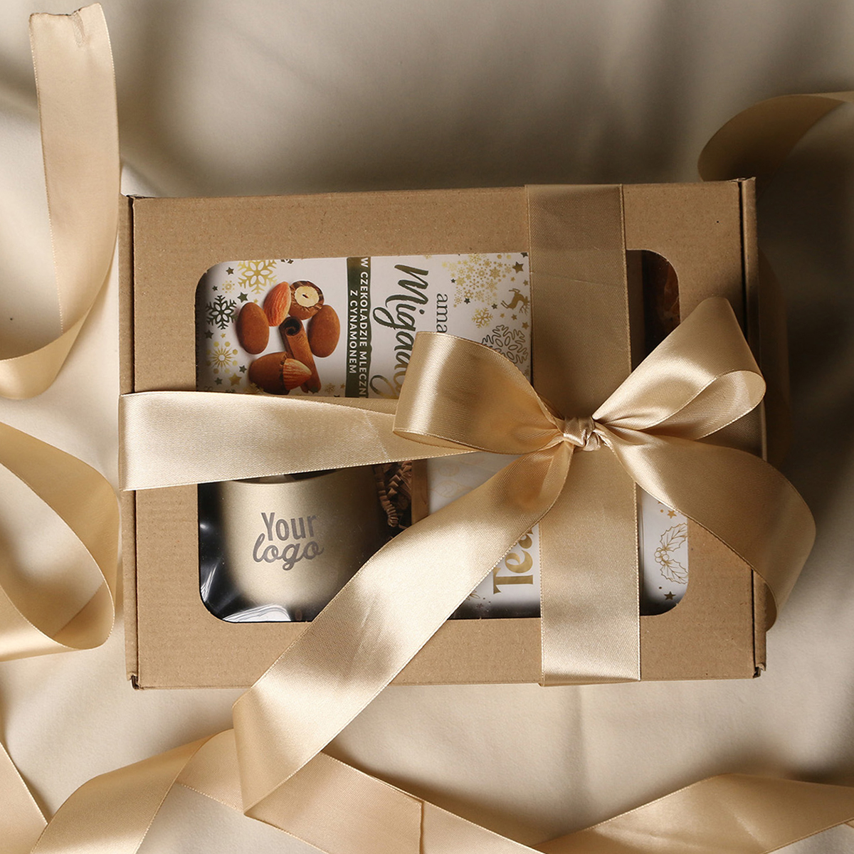 Eleganckie dodatki zdobiące opakowanie: wstążka w kolorze jasnego złota lub obwoluta