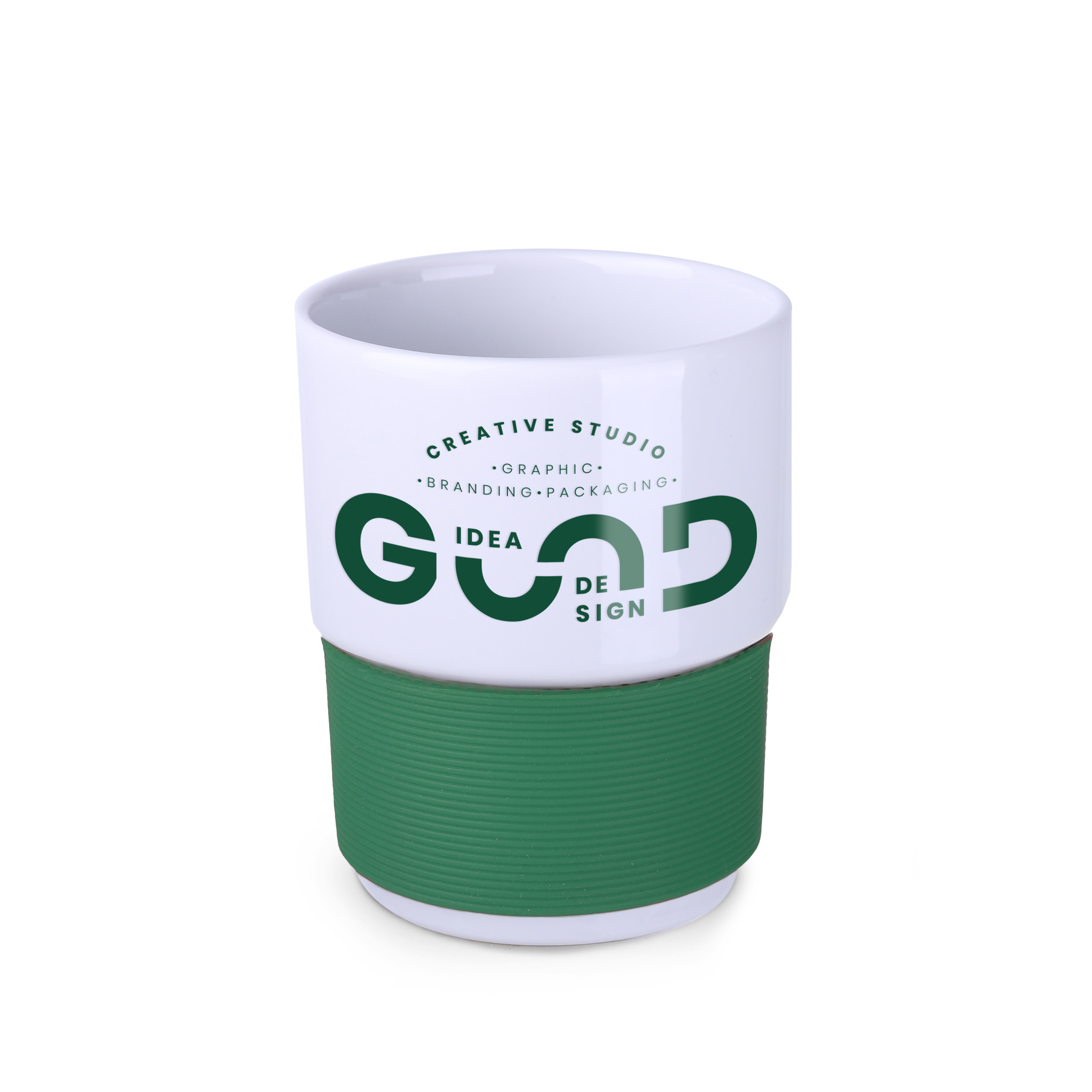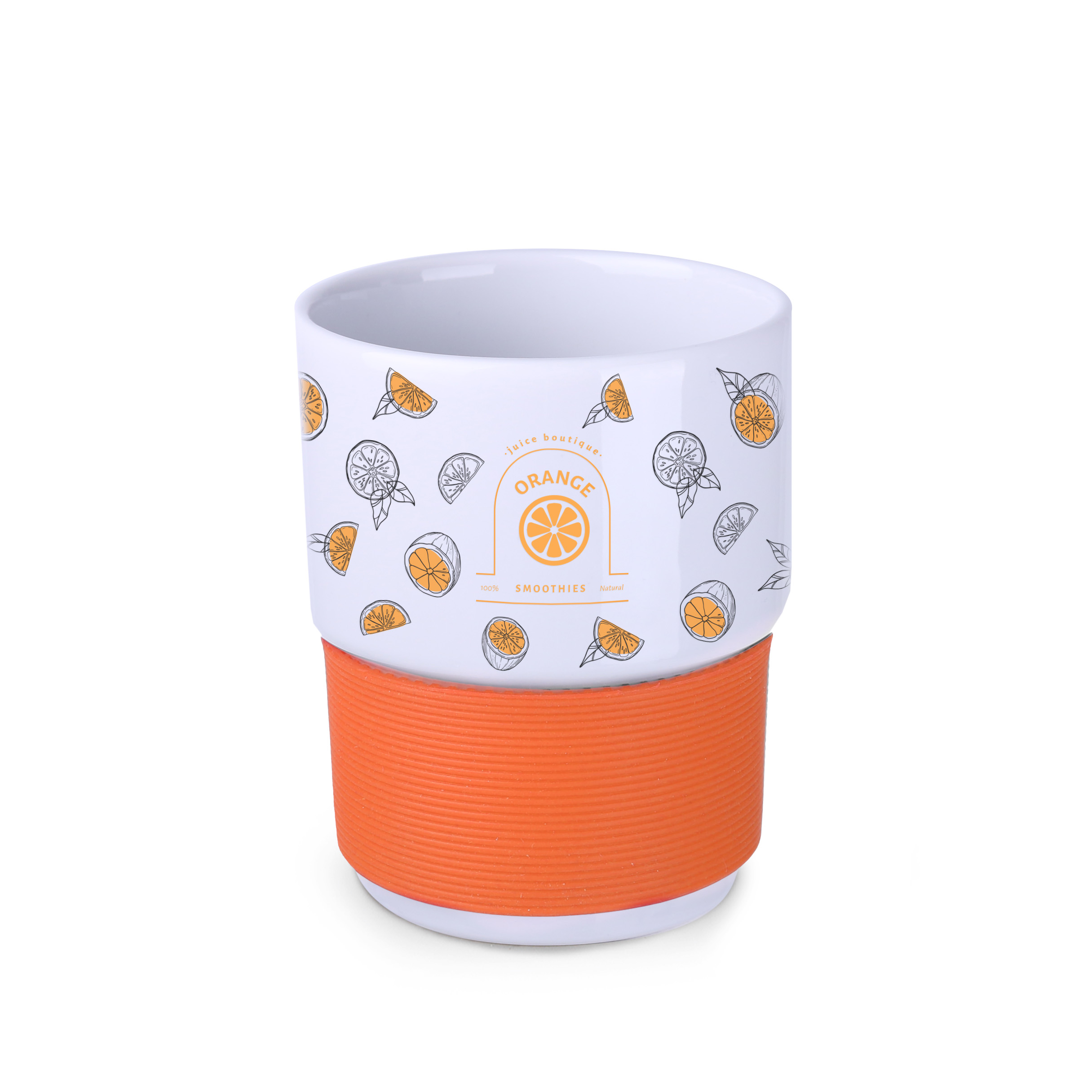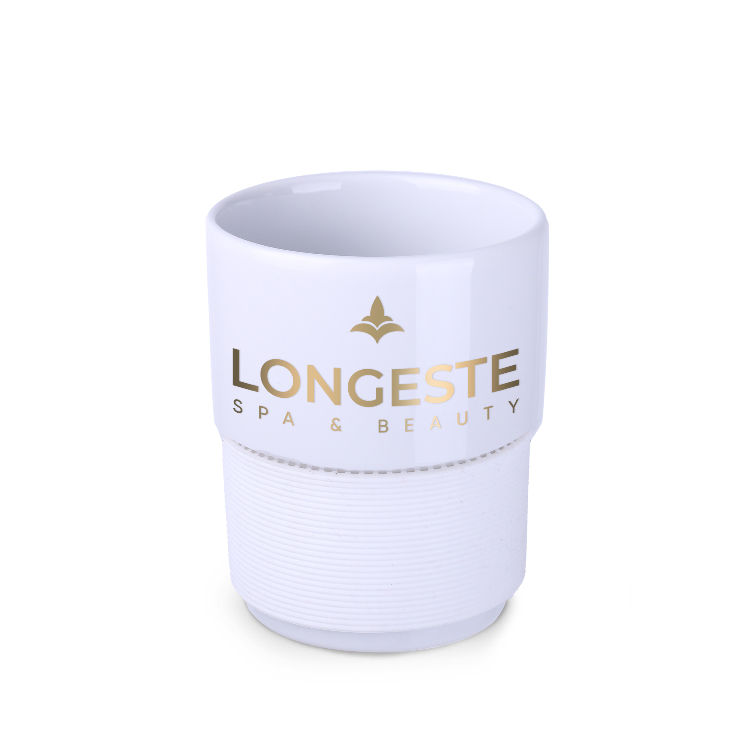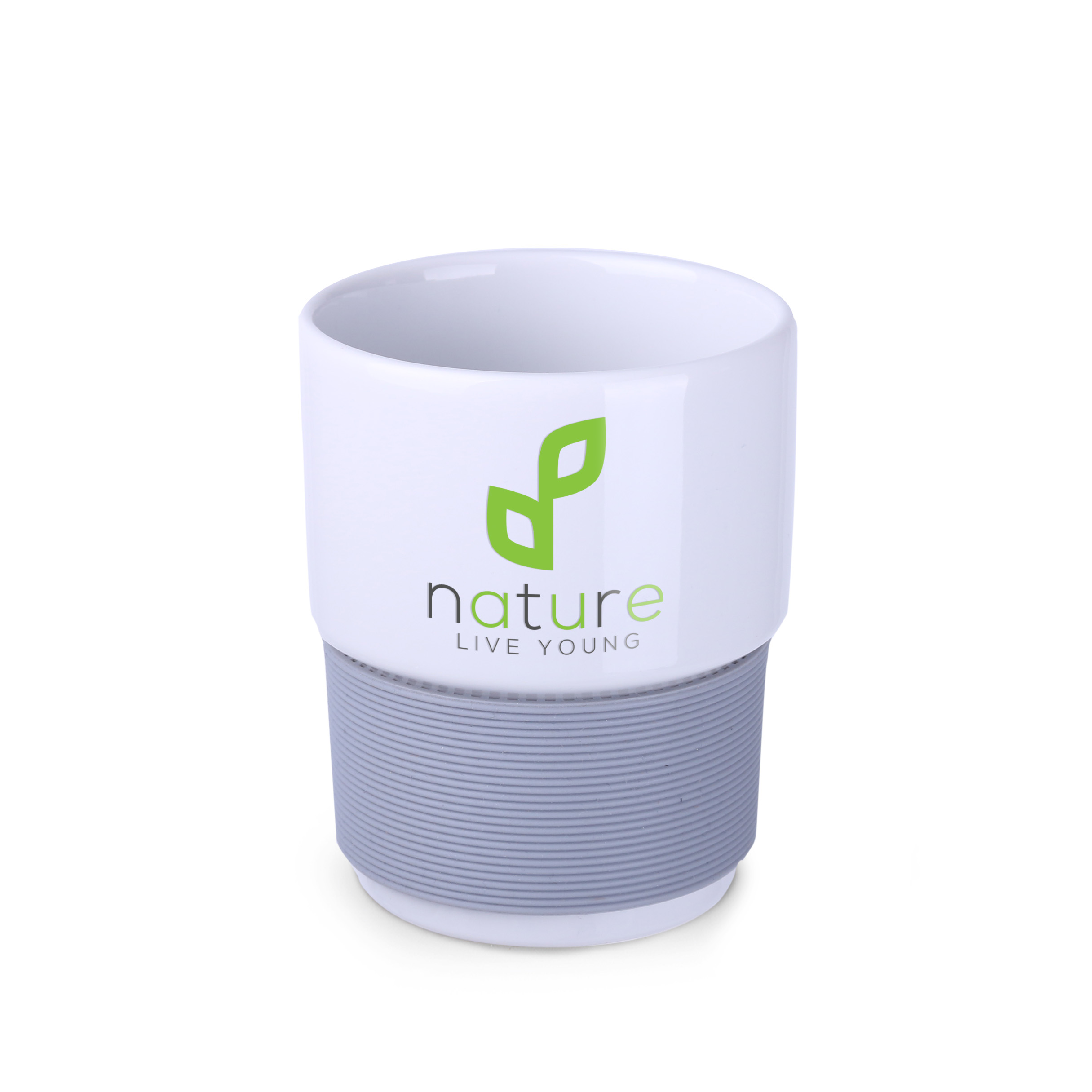 Sredniej wielkosci, porcelanowy kubek reklamowy bez uchwytu. Fason umozliwiajacym sztaplowanie. Mozliwosc zamontowania dodatkowych, izolujacych opasek (jednej opaski o szerokosci 40 mm lub 2 opasek o szerokosci 20 mm kazda). Opaski dostepne w 7 wersjach kolorystycznych: bialej, pomaranczowej, czerwonej, zielonej, granatowej, brazowej i czarnej.