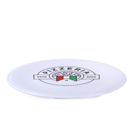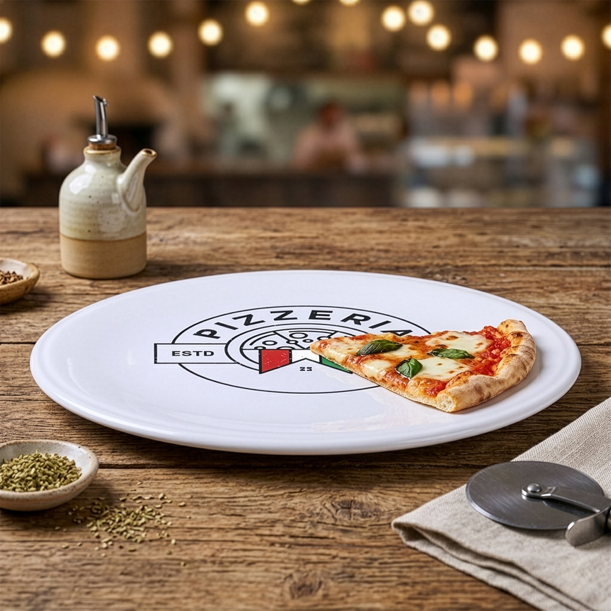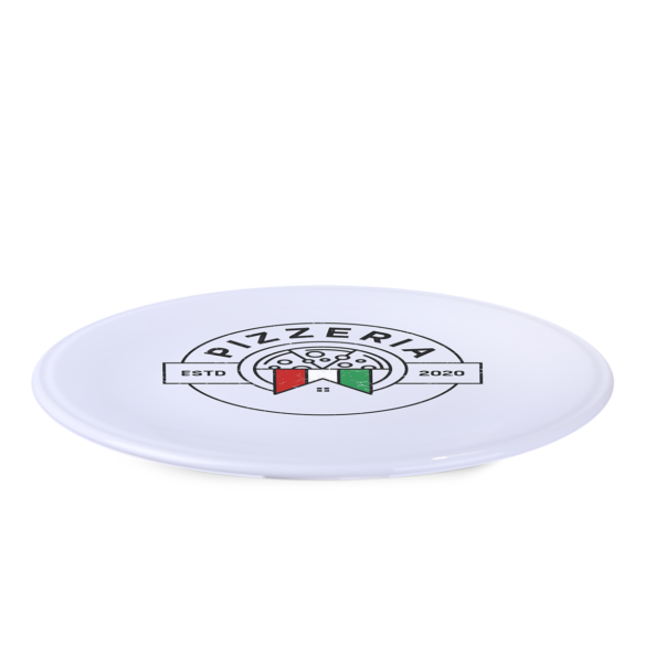 Płaski talerz do pizzy o średnicy 30 cm. Wykonany z porcelany pochodzenia europejskiego. Doskonale nadaje się do nanoszenia na niego obszernych nadruków.