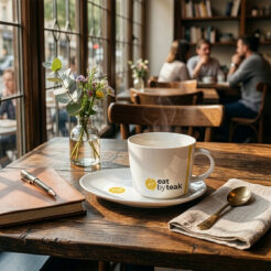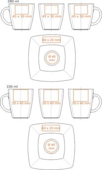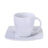 Porcelanowy set złożony z eleganckiego kubka oraz dedykowanego talerzyka. Cechą charakterystyczną tego fasonu są delikatne kwadratowe wykończenia widoczne w jego dolnej części.