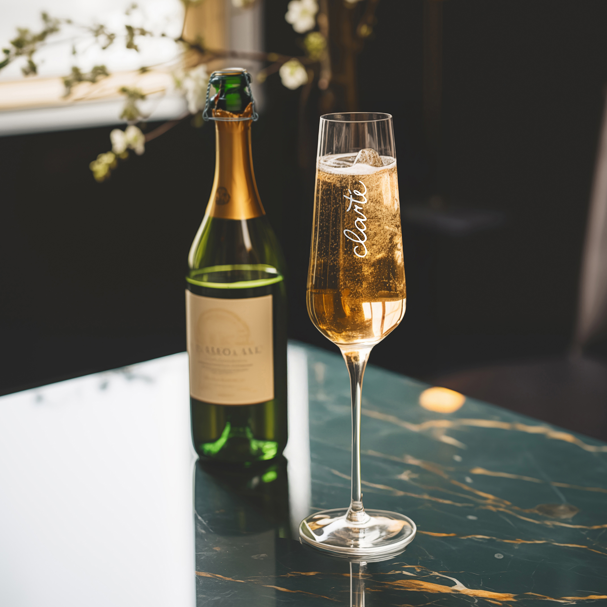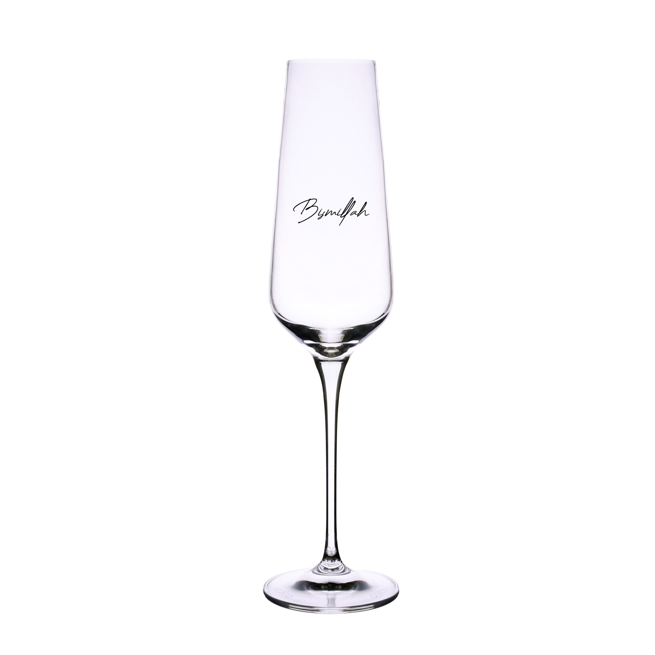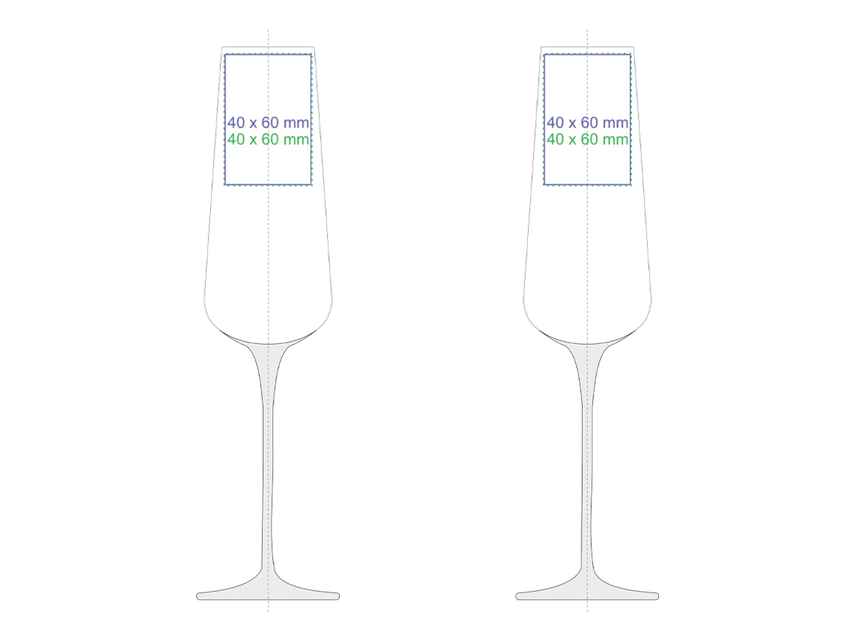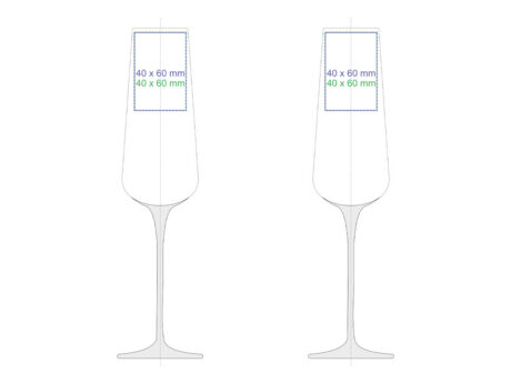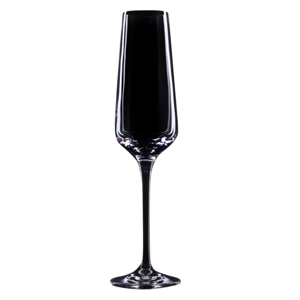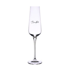 Subtelny kieliszek dedykowany do szampana. Posiada wysoką smukłą nóżkę, której stopkę można zabarwić na dowolny kolor z palety Pantone. Dodatkowo można nanosić na niego różnorodne zdobienia.