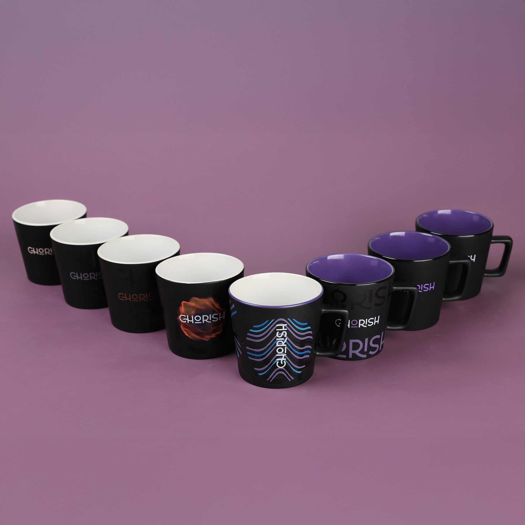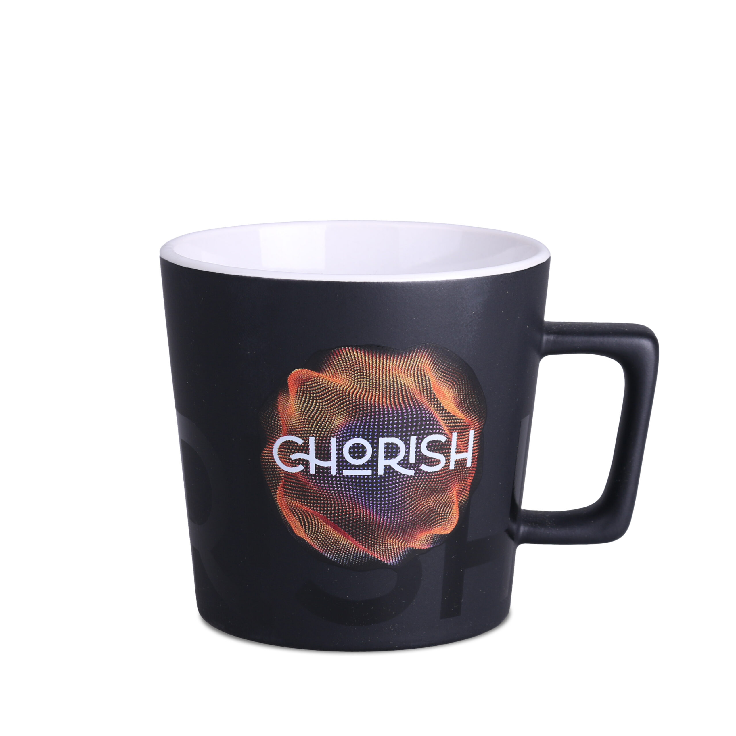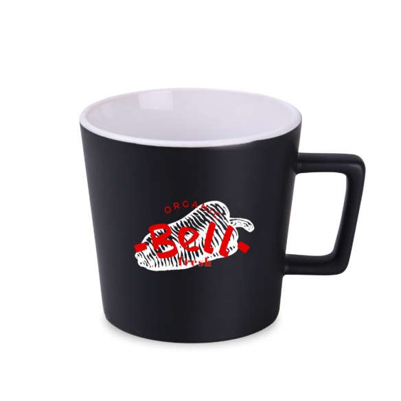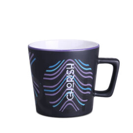 Nowoczesny kubek z czarną matową powierzchnią. Posiada ucho o ciekawym, designerskim kształcie. Posiada wnętrze w kilku kolorach.