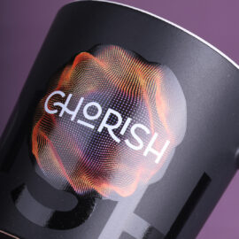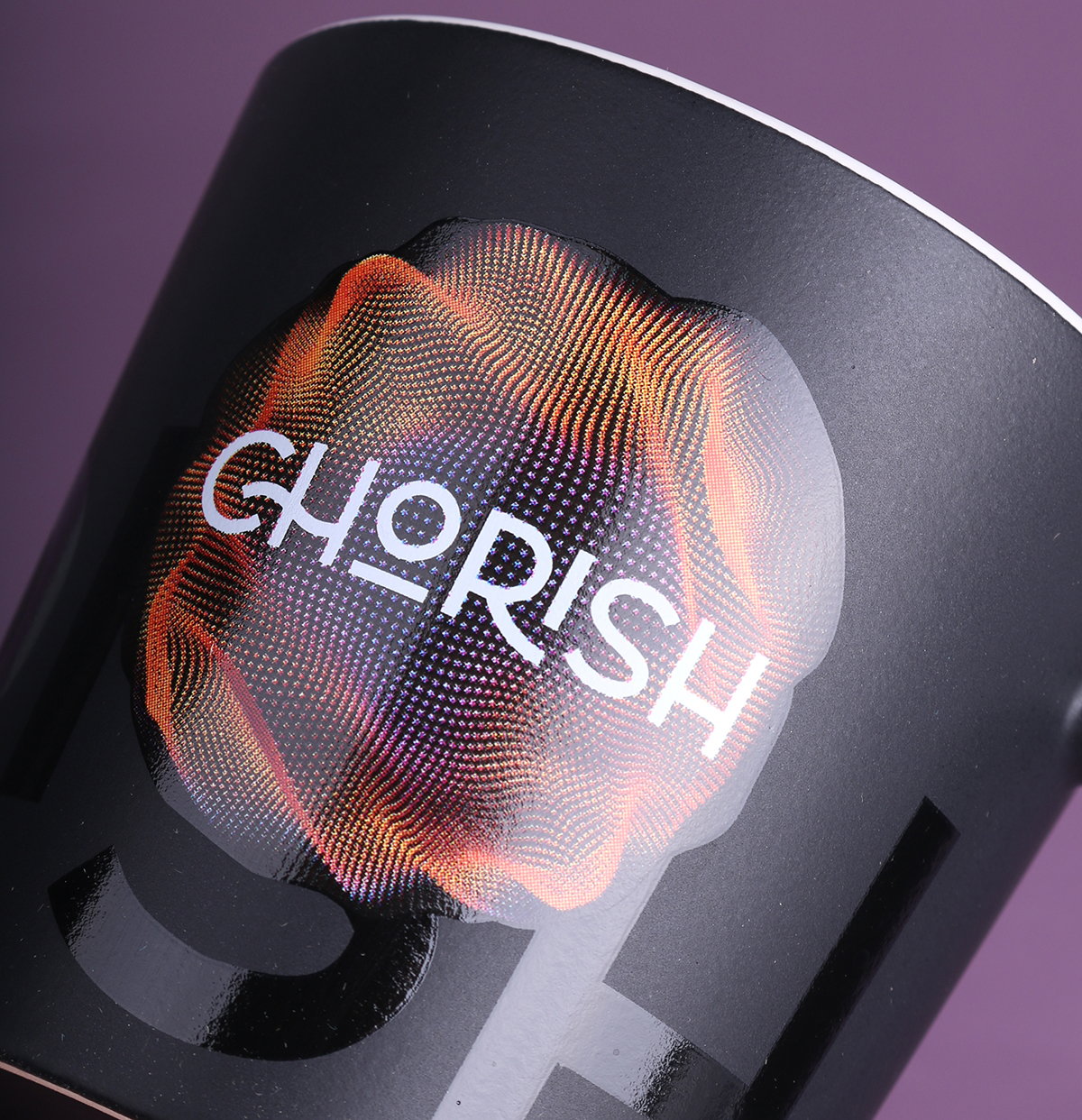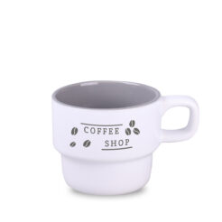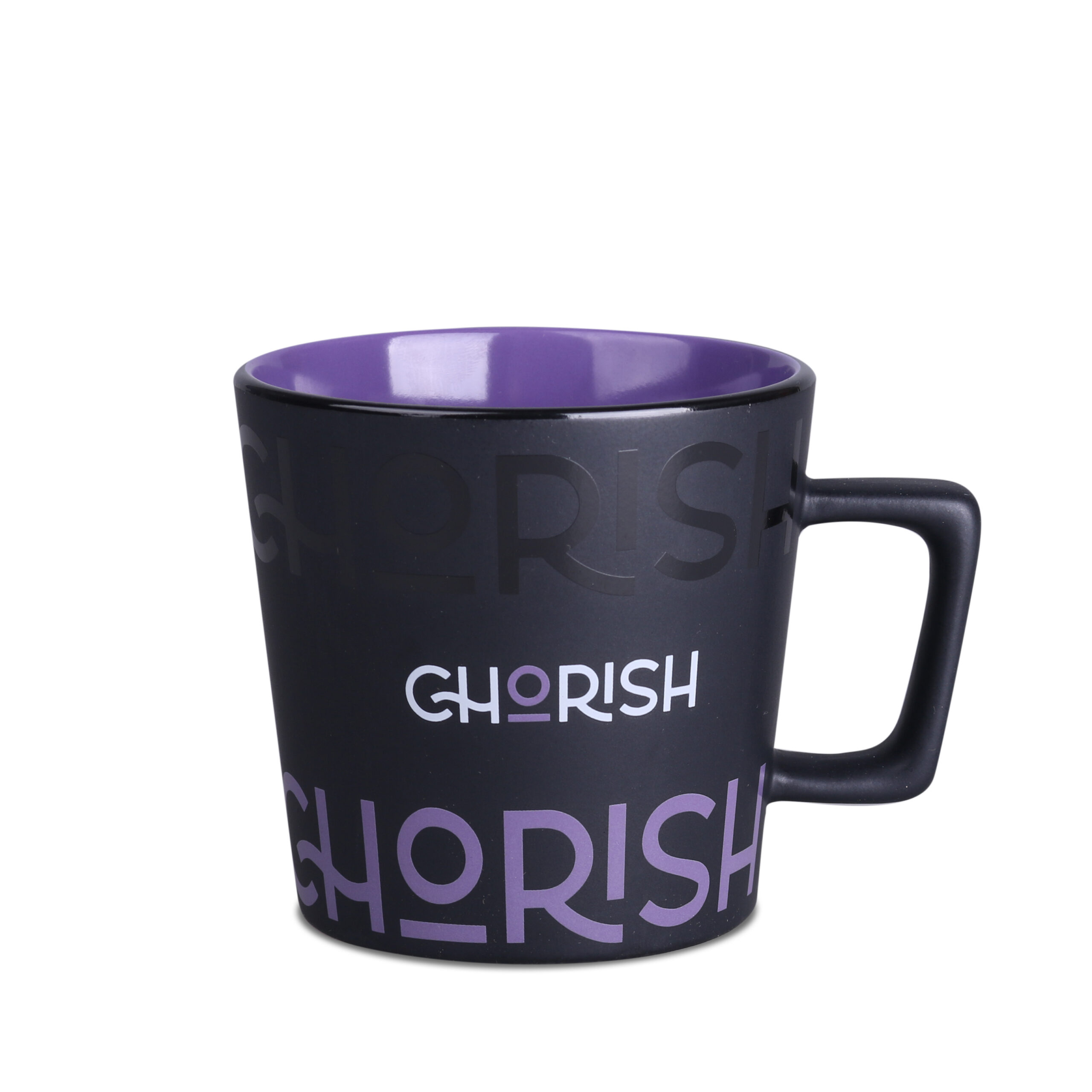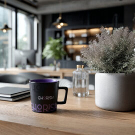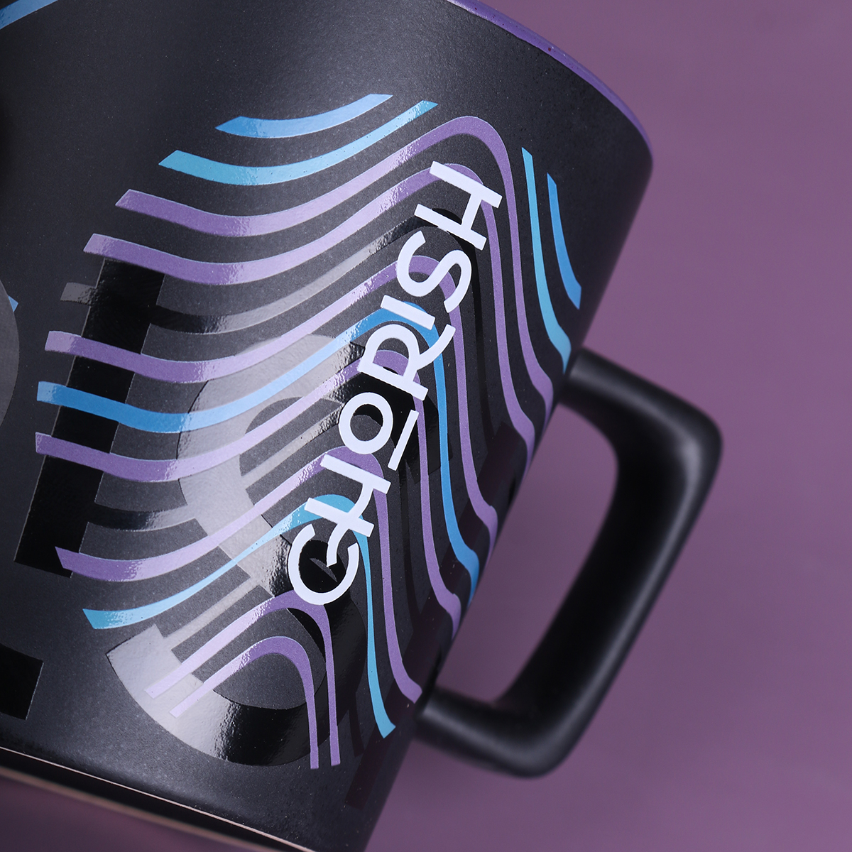 Nowoczesny kubek z czarną matową powierzchnią. Posiada ucho o ciekawym, designerskim kształcie. Posiada wnętrze w kilku kolorach.