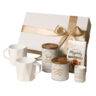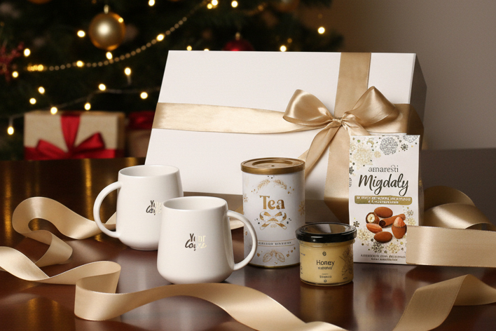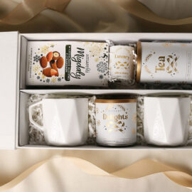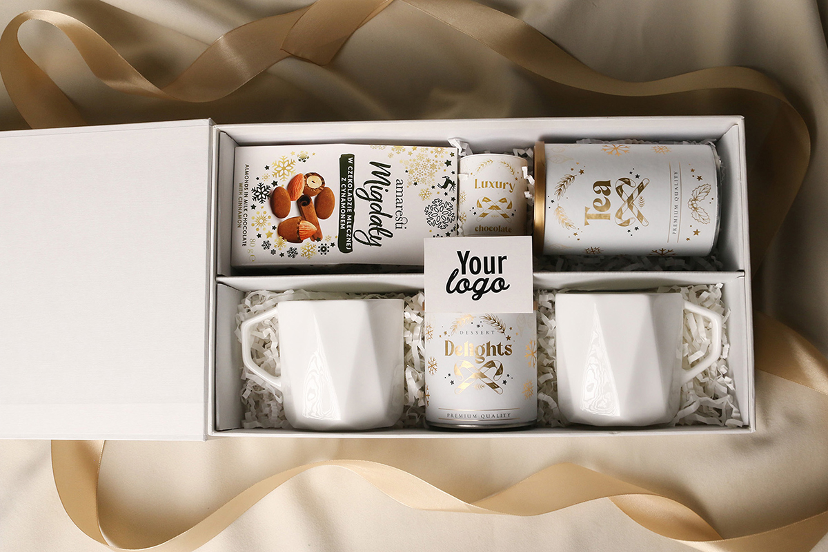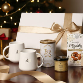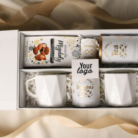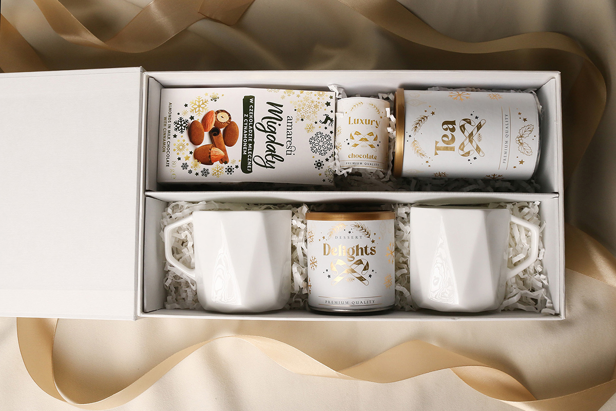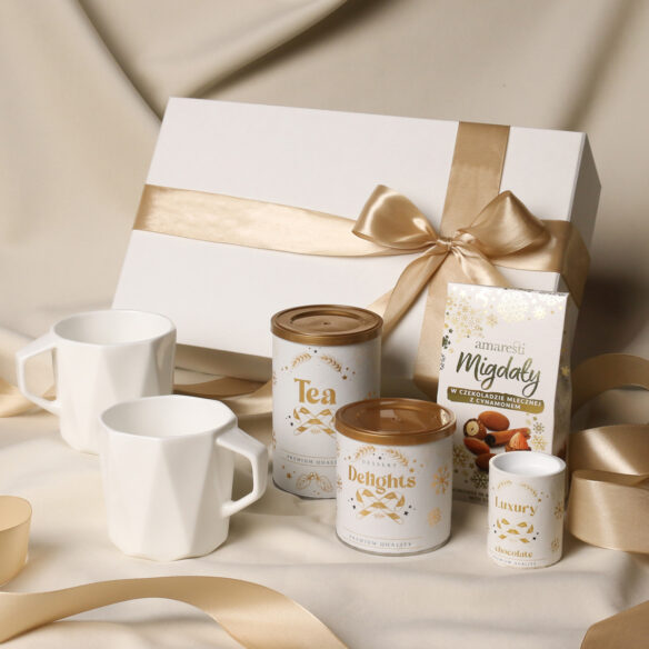 W skład zestawu wchodzą:kubek Crown biały (2 szt.) z możliwością zdobienia, zielona herbata Sencha z wiśniami, płatkami róży zapakowana w tubę z motywem zimowym, Amaresti Pralines – Migdały w czekoladzie z cynamonem, Dessert Delights – Czarna porzeczka w białej czekoladzie, Luxury Chocolate – Czekolada Belgijska do picia w tubie z motywem zimowym. Całość w stylowym, śnieżnobiałym opakowaniu z magnesem. Opcje dodatkowej customizacji: nadruk na kubkach, bilecik z logo firmy, wstążka lub obwoluta z motywem zimowym wzbogacona złoceniem.